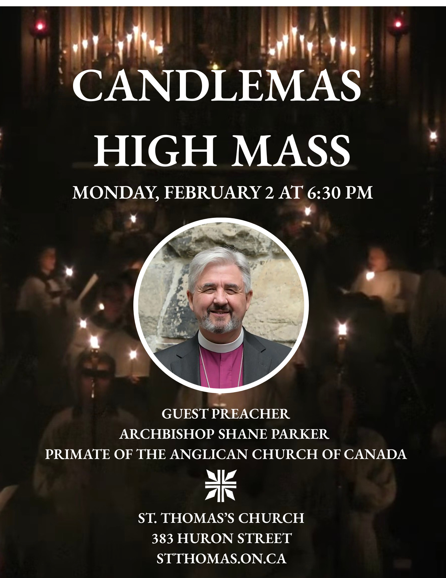 Candlemas or the Feast of the Presentation of Our Lord in the Temple will be celebrated February 2nd at 6:30 pm. The preacher will be Archbishop Shane Parker, Primate of the Anglican Church of Canada.